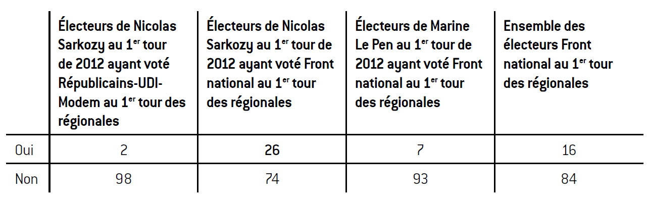 Sondage Ifop-Fiducial pour iTélé, Paris-Match et Sud Radio réalisé par Internet le 6 décembre 2015 auprès d’un échantillon national représentatif de 2 904 personnes inscrites sur les listes électorales.