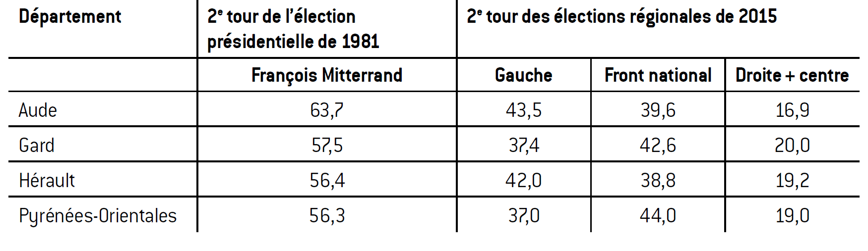 Comme le montre le tableau 4, tous ces départements constituaient ce que l’on appelait jadis le «Midi rouge» et François Mitterrand y était arrivé largement en tête en 1981.
