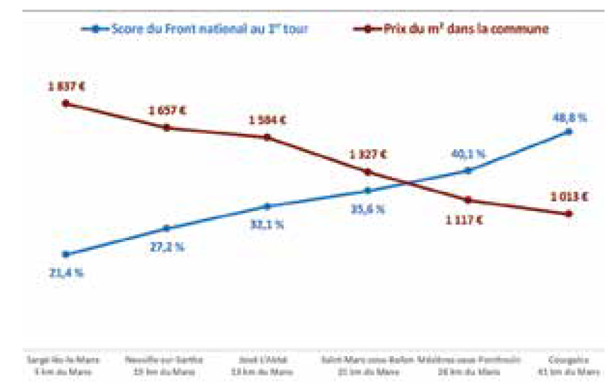 Graphique 7 : Score du Front national et prix de l’immobilier dans quelques communes du nord de la Sarthe
