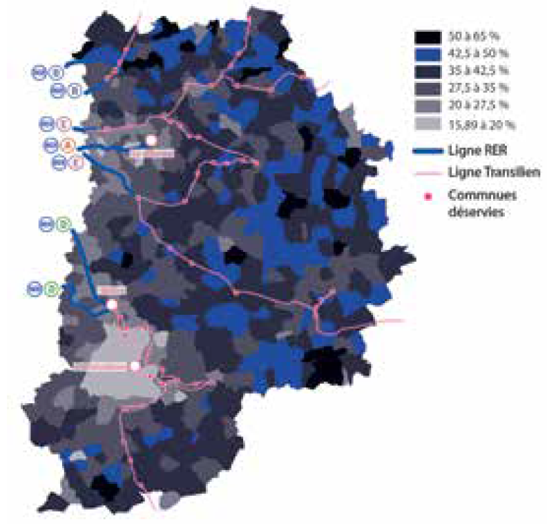 De façon générale, on constate ainsi que les communes situées ou desservies sur les lignes du RER ou du Transilien se distinguent par un niveau de vote Front national moins élevé et, inversement, que les blocs de communes où le parti frontiste a fait ses meilleurs résultats (plus de 42%) sont généralement localisés à l’écart de ces axes.