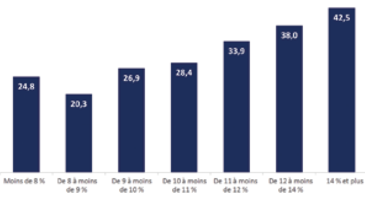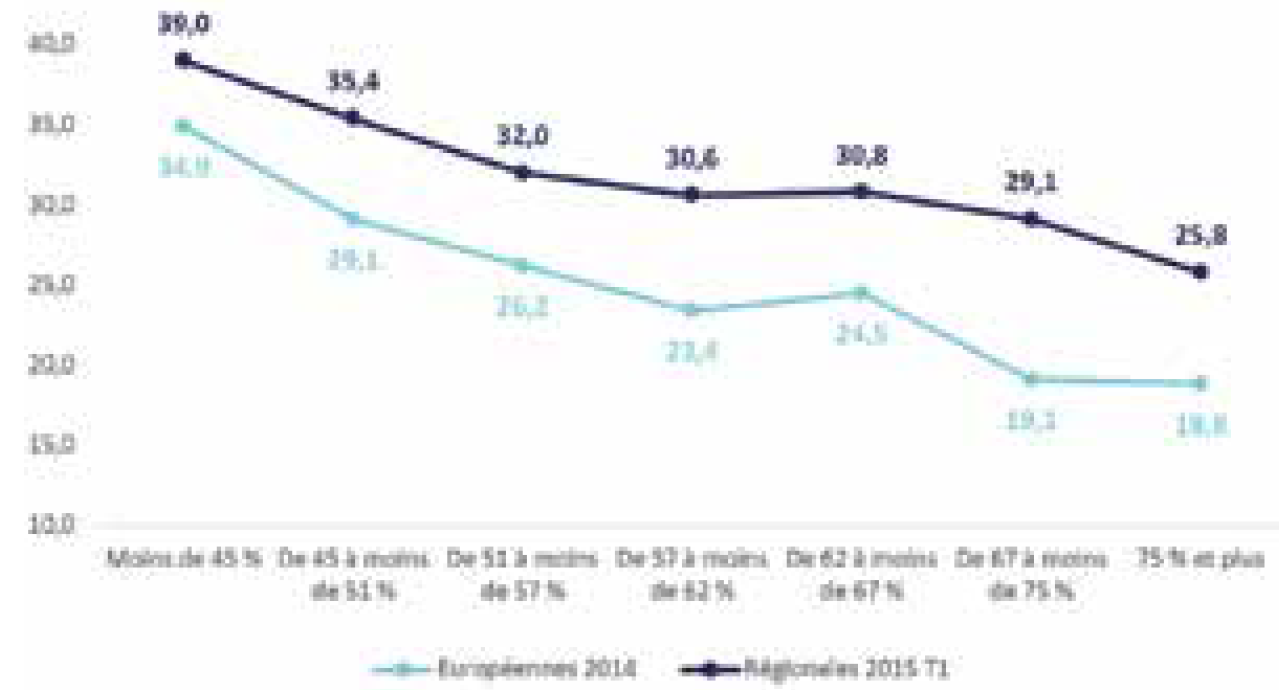 La formation lepéniste enregistre ainsi une nouvelle fois ses meilleures performances parmi les ouvriers (51%, +2 points) et auprès des employés (38%, stable), soit un total de 43 % dans les milieux populaires, mais sans y progresser de nouveau comme si le parti avait déjà fait le plein dans ces catégories. Un mouvement de hausse s’observe en revanche dans d’autres groupes sociaux traditionnellement marqués à droite : +12 points chez les artisans et commerçants et +3 points parmi les professions libérales et les cadres supérieurs. Cette tendance s’observe également au plan géographique. On rappellera tout d’abord que la proportion de foyers imposés dans une commune constitue un assez bon indicateur du niveau de richesse de la commune en question et que le niveau de vote Front national est traditionnellement clairement corrélé avec cette variable : plus la part de foyers assujettis à l’impôt est faible dans une commune, plus le vote frontiste est élevé. Cette corrélation s’est une nouvelle fois vérifiée à l’occasion du premier tour des élections régionales. Mais comme le montre le graphique 1, on constate que, par rapport aux européennes, c’est dans les communes les plus aisées que le Front national progresse le plus : +10 points dans les communes comptant de 67 à 75% de foyers imposés et +7 points dans celles en comptant plus de 75%. Inversement, la hausse n’a été que de 4,1 points dans les communes ayant moins de 45% de foyers assujettis à l’impôt. Dans ces communes modestes et populaires, où le Front national était déjà puissant, il atteint désormais en moyenne le niveau de 39%.