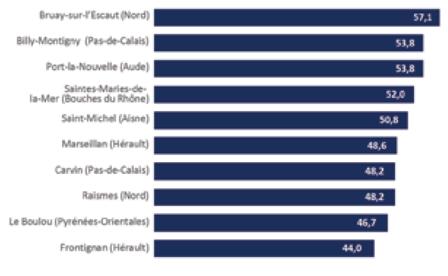 Graphique 3 : Score du Front national au 1er tour des élections régionales dans quelques communes où le taux de chômage est supérieur à 14% (en %)