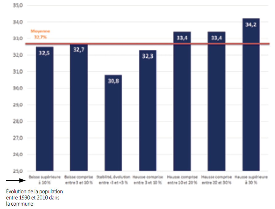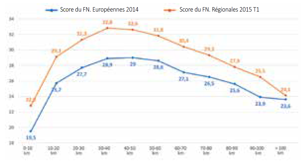 Plus la population locale a augmenté sous l’effet de l’arrivée de ménages dans les logements nouvellement créés (souvent de type pavillonnaire), et plus le Front national atteint en tendance un score important. Ce survote s’explique sans doute à la fois par l’apport de cette nouvelle population de «pendulaires» (qui habitent dans ces villages ou ces petites villes et qui vont travailler dans l’agglomération qu’ils ont souvent quittée pour devenir propriétaires), mais aussi par la modification profonde de l’identité de ces communes dont la population autochtone a vu ses repères chamboulés. À l’autre extrémité de la chaîne, le Front national superforme également dans les communes périurbaines frappées par un déclin démographique. Dans ce type de communes, ce n’est pas le développement parfois non ou mal maîtrisé de la population et du bâti qui vient renforcer la dynamique frontiste, mais au contraire le sentiment de déclin, voire d’abandon. On notera que c’est dans les communes périurbaines où la situation apparaît la plus stabilisée au plan démographique d’un recensement à l’autre que le Front national est le moins haut.