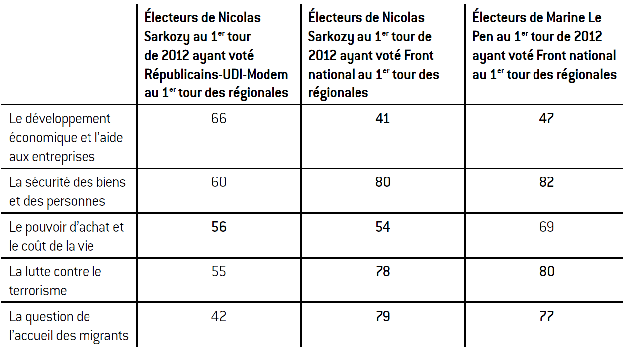 On mesure également un différentiel de 25 points entre les deux segments de l’électorat de droite sur la question du développement économique et de l’aide aux entreprises. Ce sujet apparaît comme la priorité des électeurs de droite «fidèles», alors que son importance semble beaucoup plus relative parmi les «transfuges». En termes de priorités, ces derniers, taraudés par la question identitaire et sécuritaire, placent en tête, et loin devant, la lutte contre le terrorisme et la délinquance, et la question des migrants, à l’instar des électeurs traditionnels du Front national qu’ils ont rejoints pour ce scrutin.