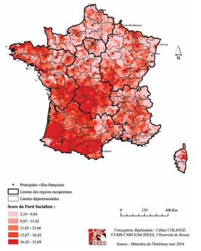 La carte du vote PS porte les stigmates de cette déroute sans précédent. Hormis les fiefs historiques du Limousin, des Landes, des Pyrénées, de l’Aude et du Poitou-Charentes, dans tout le reste du territoire le score du PS est réduit à la portion congrue, avec de vastes zones où il a été comme rayé de la carte avec des scores oscillant entre 3 et 9%, ce qui est très peu pour le parti du président de la République.