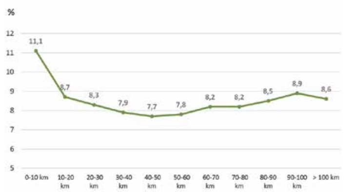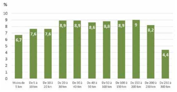 note de lecture : Dans les communes situées entre 10 et 20 kilomètres de l’aire urbaine de 200 000 habitants la plus proche, EELV a obtenu en moyenne 8,7 % des voix.