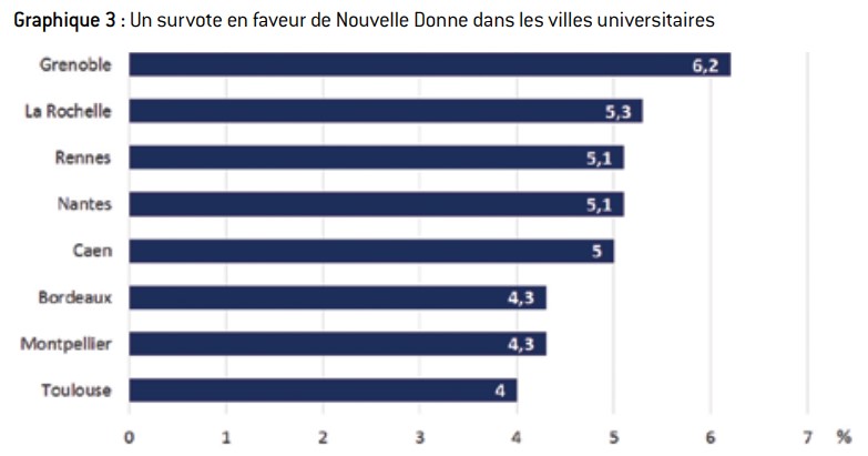 graphique 3 : un survote en faveur de Nouvelle Donne dans les villes universitaires