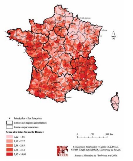 Dans ce contexte particulier, une partie de l’électorat socialiste traditionnel a pu localement préférer EELV ou Nouvelle Donne, cette prime permettant à ce bloc de virer devant le PS dans ces endroits. Mais hormis ces quelques cas particuliers, nous sommes bien en présence de la carte des « deux gauches » qui correspond aussi, peu ou prou, à la carte du rapport à l’Europe. Le PS arrive en tête de la gauche dans les régions les moins acquises à la construction européenne, tandis qu’EELV et Nouvelle Donne le devancent dans les régions les plus europhiles, comme si l’électorat de gauche le plus allant en matière d’avancées européennes s’était plutôt retrouvé dans ces partis que dans le PS.