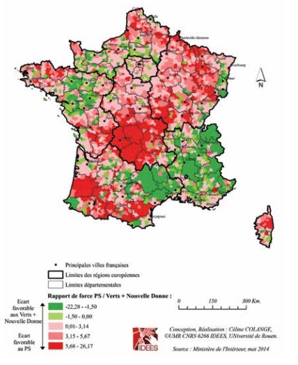 carte 6 : rapport de forces Parti socialiste/eeLV + Nouvelle Donne aux élections européennes 2014 (en % des suffrages exprimés)