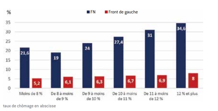 note de lecture : Dans les communes où le taux de chômage est inférieur à 8 %, le FN a obtenu en moyenne 21,6 % des voix et le Front de gauche 5,2 %.