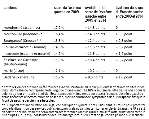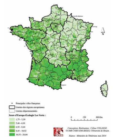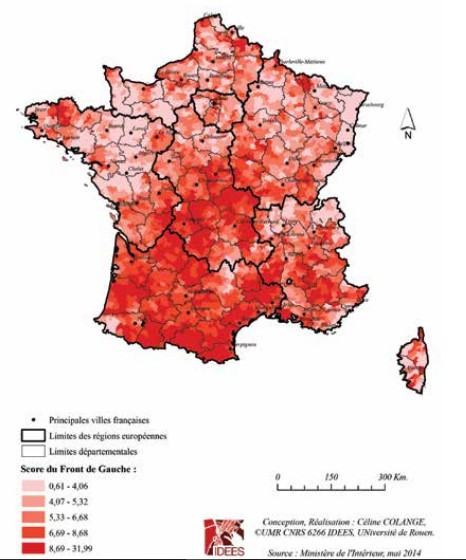 En l’absence de la locomotive Cohn-Bendit, la formation écologiste est en fort recul mais concurrence, comme en 2009, le PS dans les régions les plus proeuropéennes (Rhône-Alpes, Île-de-France, Bretagne).Une analyse plus fine laisse également apparaître, par-delà les centres des grandes métropoles, des points d’appuis dans certains territoires ruraux. Le Front de gauche, quant à lui, maintient son score par rapport à 2009 et à ses positions structurées autour d’une implantation communiste en déclin s’ajoute la zone d’influence de Mélenchon dans le Sud-Ouest. Mais il ne capte donc pas les déçus du hollandisme ni les victimes de la crise économique, les territoires les plus frappés par le chômage se tournant beaucoup plus massivement vers le FN.