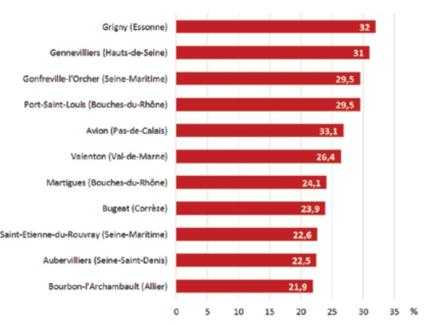 C’est notamment le cas dans de nombreuses communes minières. On peut ainsi citer Billy-Montigny (22,9%) et Sallaumines (18,4%), dans le Pas-de- Calais ; Villerupt (24,5%) et Jarny (18,1%), en Lorraine ; La Ricamarie (19,7%), dans la Loire ; La Grand-Combe ou Chamborigaud (24,5% dans les deux villes), dans le bassin minier d’Alès (Gard) ; Decazeville (22,1%) et Aubin (25,1%), dans l’Aveyron ; ou bien encore Corsavy (25,5%) et Corneilla-de-Conflent (24,2%) dans le massif du Canigou (Pyrénées- Orientales). Alors même que l’extraction du charbon ou du minerai de fer y a cessé il y a vingt-cinq voire quarante ans, la population de ces communes demeure marquée par cette histoire particulière et une proportion significative de ces électeurs, souvent âgés, reste fidèle au PCF et, désormais, au Front de gauche. De la même façon qu’Hervé Lebras et Emmanuel Todd ont pu parler d’un « catholicisme zombie », on pourrait évoquer ici un « communisme zombie » dont la traduction électorale perdure localement alors que les conditions socio-économiques ayant prévalu au développement d’une conscience de classe et à un fort vote de gauche ont disparu depuis longtemps.
