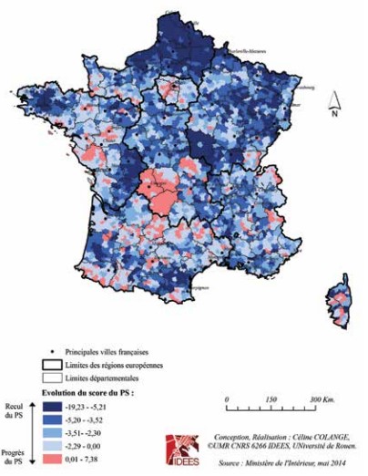 Des pertes, notamment au profit du FN, sont aussi à souligner dans des espaces plus ruraux où le PS est implanté de longue date mais où il a reculé assez sensiblement par rapport à 2009. C’est le cas en Saône-et-Loire et dans la Nièvre, dans la Vienne et en Charente ou bien encore dans les Landes ou l’Aude. Dans tout le Centre-Bretagne, constitué de campagnes historiquement acquises à la gauche, le PS est aussi en fort repli mais cette fois sous la concurrence des Bonnets rouges (voir notre note « Européennes 2014 (2) : poussée du FN, recul de l’UMP et vote breton »).