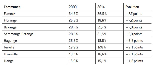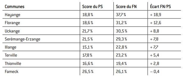 La baisse est également marquée dans les communes voisines de Fameck (-7,7), Serémange-Erzange (– 7,2), Uckange (– 7) ou bien encore Hayange (– 6,8), qui constituent la vallée industrielle de la Fensch, durement frappée par la crise1. Et, plus grave encore pour les socialistes et leur candidat, c’est à Hayange2 et à Florange que l’avance de la liste FN sur celle du PS est la plus importante.