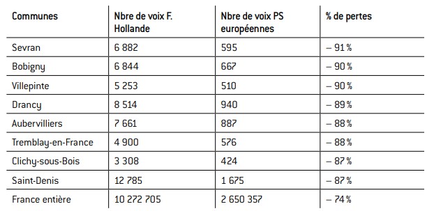 Enfin, le PS est en très fort recul dans les communes de banlieues où l’électorat populaire et/ou issu de l’immigration, qui s’était fortement mobilisé pour François Hollande et contre Nicolas Sarkozy lors de l’élection présidentielle de 2012, a cette fois très massivement boudé les urnes et le PS. Dans ces villes, si l’on ne raisonne pas en pourcentages des suffrages exprimés mais en nombre de voix, l’hémorragie est colossale, puisque par rapport au premier tour de l’élection présidentielle le PS perd autour de 90% de ses électeurs !