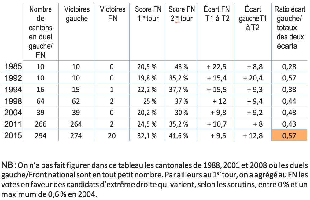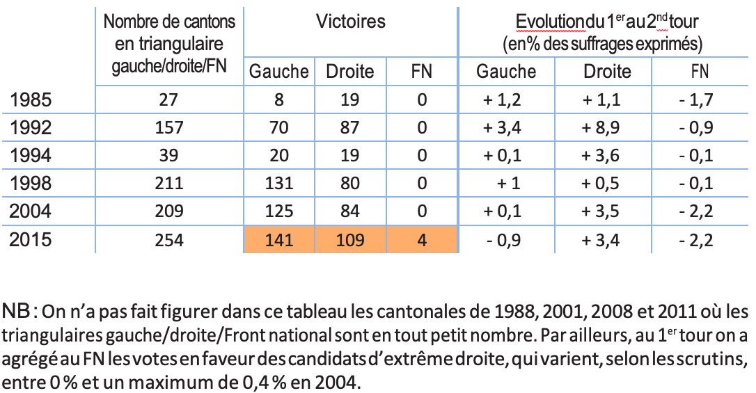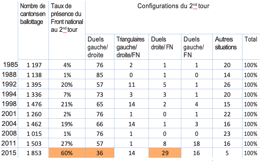 Le grand changement politique intervient aux élections départementales de 2015, où le Front national, après avoir déjà réalisé cette performance aux européennes de 2014, se place en tête du scrutin au premier tour avec 25,2% des suffrages exprimés. Il se qualifie pour le second tour dans 60% des cantons en ballottage, bouleversant l’ordre électoral établi. Cependant, avec l’élévation de la barre de qualification à 12,5% des inscrits, la proportion des triangulaires gauche-droite-Front national reste proche de ses précédents records, retrouvant avec 14% des affrontements ses niveaux de 1998 et 2004. De même, la proportion de duels gauche-Front national, qui avait déjà beaucoup augmenté en 2011, reste, avec un taux de 16% des affrontements, à un niveau comparable au scrutin précédent. C’est la proportion de duels droite-Front national qui augmente considérablement, passant de 8% en 2011, pourtant son taux le plus élevé jusque-là, à 29% en 2015.