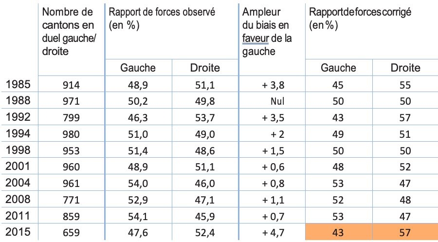 Le biais observé en 2015 est le plus important de la série que nous avons pu reconstituer depuis le scrutin cantonal de 1985, ce qui signifie que les cantons où la gauche est parvenue à accéder à la situation de duel avec la droite lui sont particulièrement favorables. L’affichage d’un rapport de force de 47,6% pour la gauche et de 52,4% pour la droite est trompeur. Le score de la gauche doit être amputé de 4,7 points pour apprécier la réalité du rapport de force gauche/ droite, ce qui le ramène à 43/57, le plus mauvais observé dans cette série de dix élections cantonales et départementales à égalité avec le scrutin de 1992. Une référence peu rassurante pour la gauche puisque, cette année-là, elle avait subi une véritable déroute, annonciatrice de la plus lourde défaite de son histoire aux législatives de 1993 où au second tour de scrutin le rapport gauche/droite corrigé de son biais s’établissait aussi au niveau exceptionnel de 43/57.