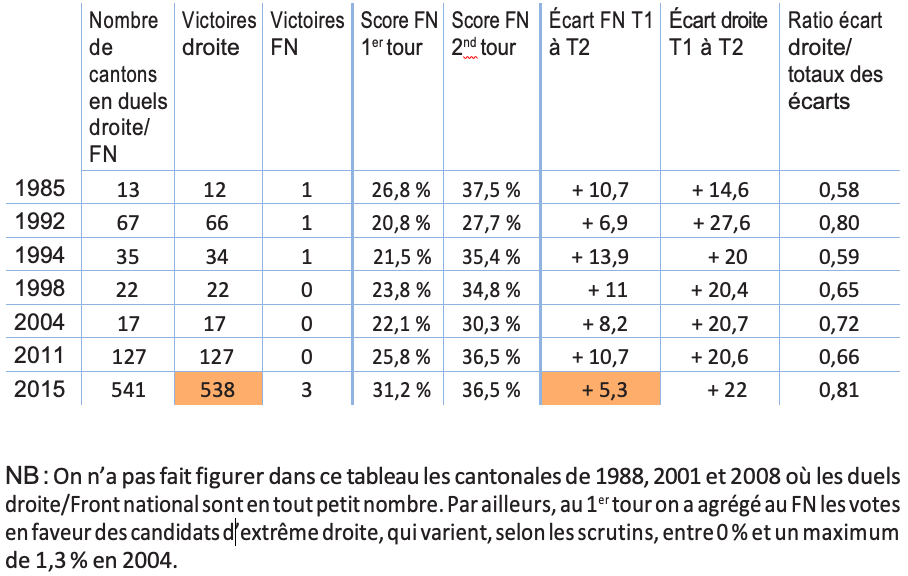 Les seconds tours des élections intermédiaires de 2015 diffèrent des enseignements du premier tour, car ils ont pour objet presque principal d’apporter une réponse à la percée du Frontnational. La formation de Marine Le Pen apparaît ainsi comme le parti vainqueur du premier tour, puis comme le parti vaincu du second. L’état-major de l’UMP s’est prononcé pour le « ni-ni » encas d’affrontement gauche-FN ; la direction socialiste ne cesse de mettre sur le même plan une droite devenue à ses yeux extrémiste et un Front national toujours d’extrême droite. Mais, confrontés au risque de victoire du FN, chacun agit pour en réduire les chances.
