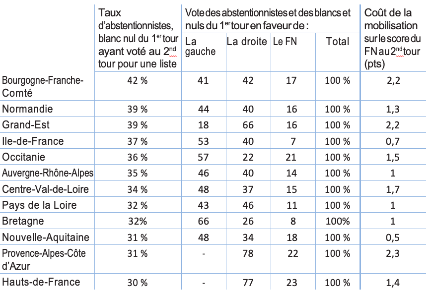 Dans ses espoirs de conquête, le Front national échoue même dans les triangulaires opaques où l’électeur anti-FN ne peut savoir qui du vote de gauche ou du vote de droite est efficace pour le battre. Le Front national est battu sur le fil en Bourgogne-Franche-Comté où la forte mobilisation des abstentionnistes du premier tour, bien que se partageant parfaitement entre gauche et droite, lui coûte la victoire. Si l’on recalcule en effet les résultats du second tour enexcluant les abstentionnistes du premier tour venus aux urnes au second, le FN l’aurait emporté d’un souffle sur la tête de liste socialiste finalement victorieuse.