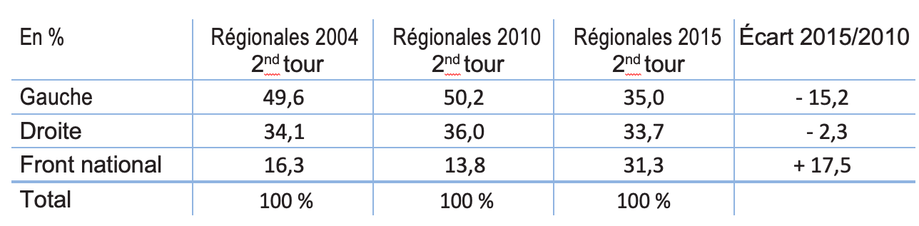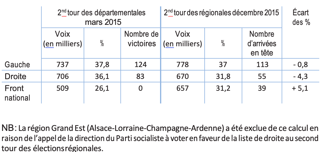 En 2015, la tendance s’inverse en faveur de la gauche, sans doute pour deux raisons. Tout d’abord, une fraction des électeurs de la droite entre 2012 et 2015 a rejoint dès le premier tour le vote FN et dès lors ne peut plus lui fournir un apport supplémentaire au second tour. En second lieu, la puissance du Front national change sans doute la perception qu’en ont les électeurs de droite : loin de la force d’appoint au RPR puis à l’UMP qu’il pouvait constituer, il peut désormais apparaître comme la force dominante au risque de renvoyer la droite classique au rang d’une force secondaire. Pour une partie des électeurs de droite, il s’agit, en freinant les succès possibles du Front national, de réduire un tel risque.