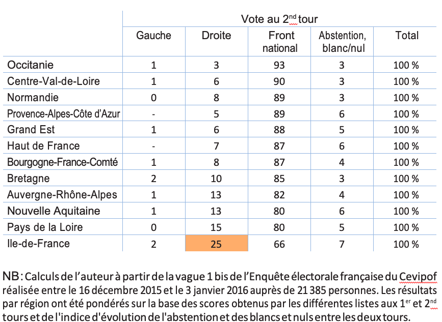Calculs de l’auteur à partir de la vague 1 bis de l’Enquête électorale française du Cevipof réalisée entre le 16 décembre 2015 et le 3 janvier 2016 auprès de 21.385 personnes. Les résultats par région ont été pondérés sur la base des scores obtenus par les différentes listes aux 1er et 2nd tours et de l’indice d’évolution de l’abstention et des blancs et nuls entre les deux tours.