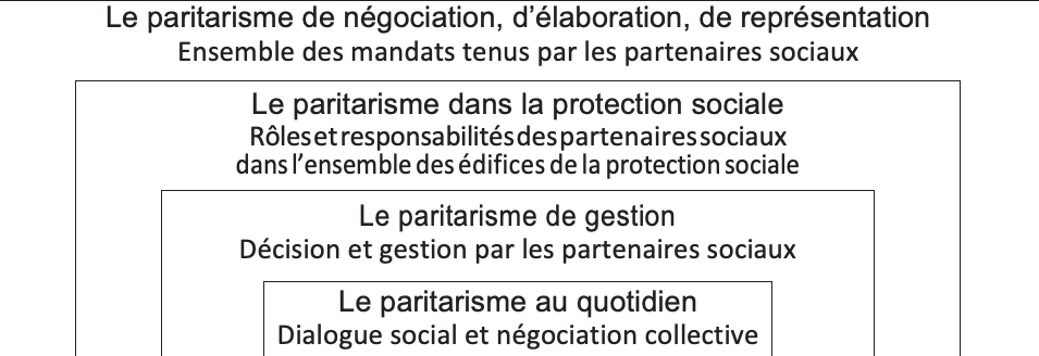 En tout état de cause et de vocabulaire, le paritarisme se trouve bien dans un spectre qui va d’une définition très large (lato sensu), emportant toutes les instances où se retrouvent ensemble les représentants des employeurs et des travailleurs, à une définition restreinte (stricto sensu), où l’on condense les instances nées de la négociation collective et dont les partenaires sociaux sont presque entièrement responsables.