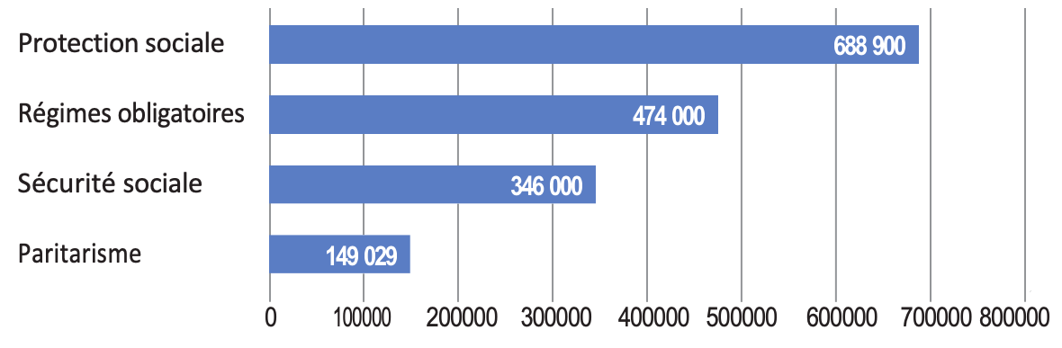 Dans le même ordre d’idées, selon l’Institut Montaigne, il en va bien de l’ordre de 150 milliards d’euros gérés dans le cadre du paritarisme de gestion20. Pour les plus grandes masses, les experts de l’Institut identifient : 58,6 milliards d’euros pour les retraites complémentaires AGIRC-ARRCO (16,6 milliards pour l’AGIRC et 42 milliards pour l’ARRCO) ; 35 milliards pour l’assurance- chômage ; 13,75 milliards d’euros pour la formation professionnelle (uniquement le financement par les entreprises) ; 13,1 milliards d’euros pour la prévoyance ; 4 milliards pour le logement.