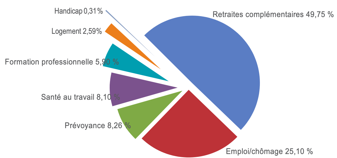 À ces deux principales composantes s’ajoutent, pour un total d’un quart du paritarisme stricto sensu, des politiques et dépenses relevant de la prévoyance, du logement (l’effort des employeurs pour la construction, c’est-à-dire le fameux « 1% ») et de la santé au travail.