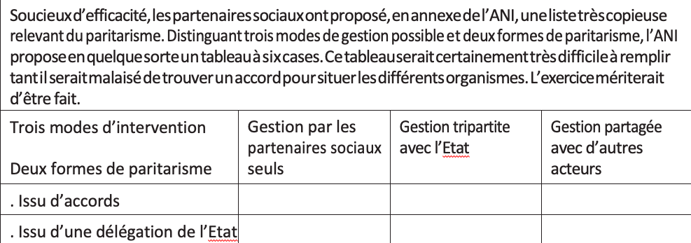 Selon la rédaction de cet ANI, le champ du paritarisme de gestion intègre deux formes de paritarisme (issu des accords, issu d’une délégation de l’État) et trois modes d’intervention des partenaires sociaux : gestion par les partenaires sociaux seuls, gestion tripartite avec l’État, gestion partagée avec d’autres acteurs. Dans le premier cas, il s’agit de la mise en œuvre de règles fixées par les seuls partenaires sociaux : c’est le paritarisme de gestion au sens le plus strict, qui vise des organismes créés et gérés uniquement par les partenaires sociaux. On retrouve cette gestion, en théorie exclusivement paritaire, dans trois domaines: