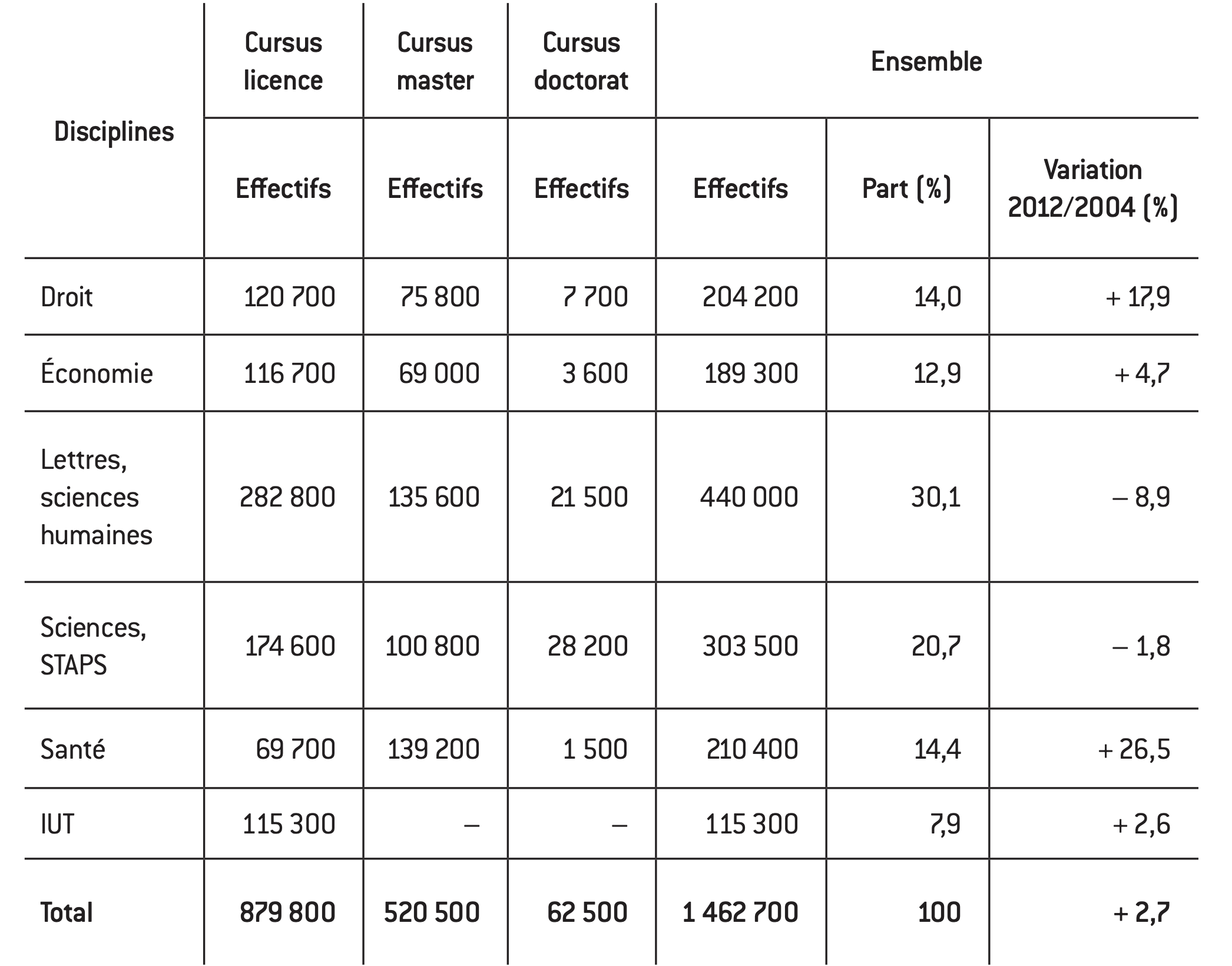 Tableau 1 : répartition des effectifs des universités françaises par cursus et par groupe en 2012-2013