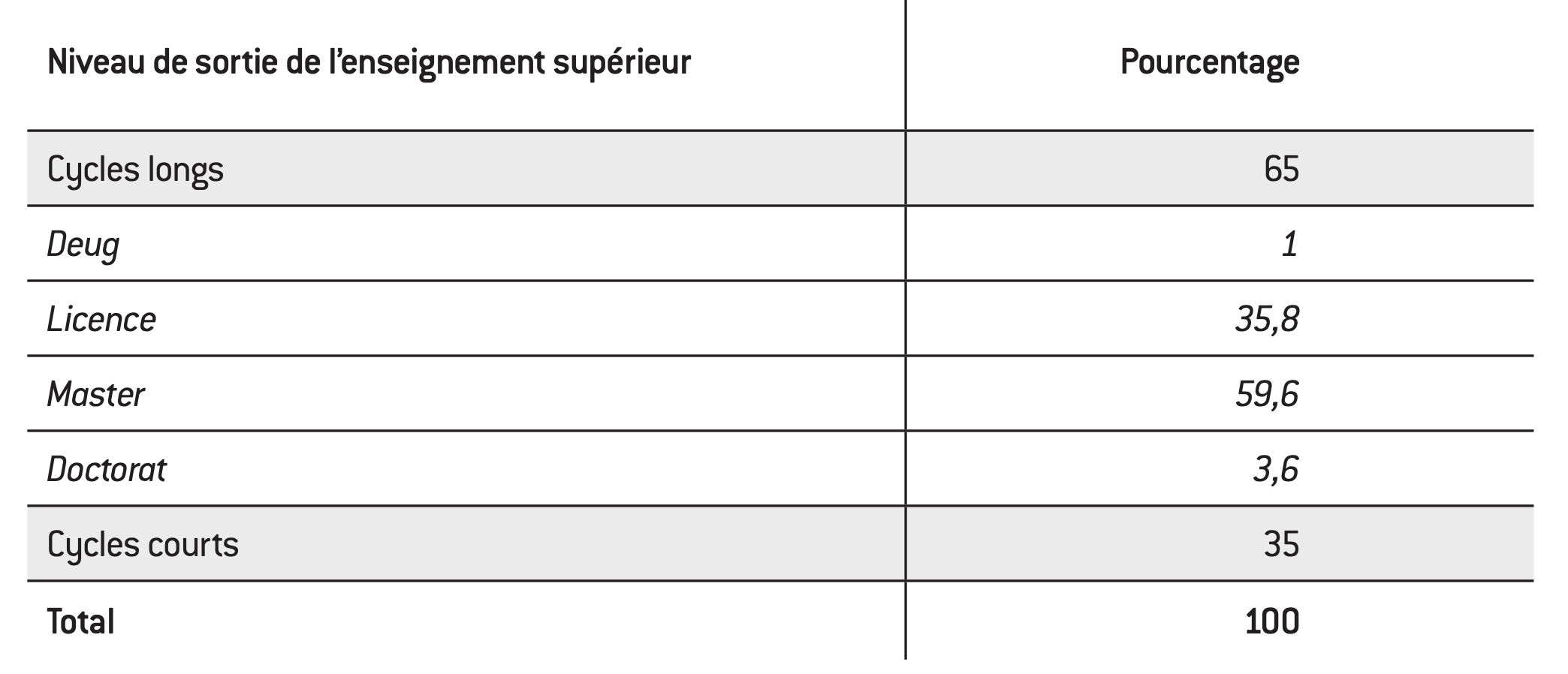 La deuxième conséquence est l’allongement de la durée moyenne des études, avec une prédominance des diplômes de niveaux bac + 3 et bac + 5. Parmi les jeunes sortant de formation initiale en 2009, 2010 et 2011, 42% sont diplômés du tertiaire, soit environ 297.000 personnes. Sur ces 297.000, le total des cycles longs (doctorat, master, licence) représente 65%, contre 35% pour les cycles courts professionnalisant (BTS, DUT)16. Au sein du groupe diplômé d’un cycle long, 1% ont un bac + 2 (Deug), 35,8% ont une licence, 59,6% un master et 3,6% sont docteurs (voir tableau 2).