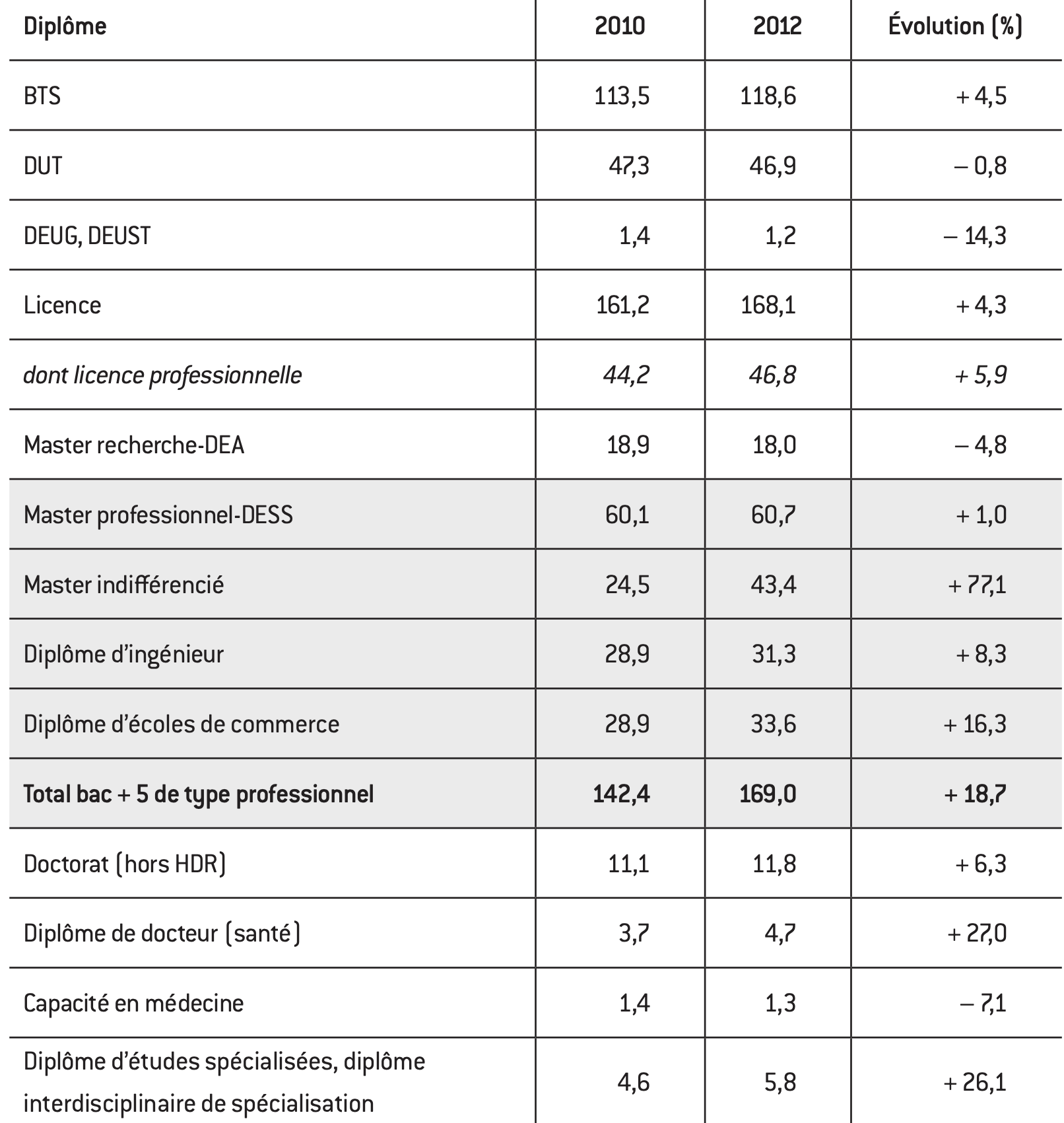 « La généralisation du LMD [licence-master-doctorat] a entraîné, par un jeu de vases communicants, une élévation du niveau général […]. Les sorties au niveau M1 se sont raréfiées, alors que le master 2 est en passe de devenir le diplôme le plus délivré. Au final, en 2010, près d’un jeune sur trois issus de l’enseignement supérieur entre sur le marché du travail avec un diplôme du supérieur long en poche (bac + 5 et plus)17. » L’analyse du Centre d’études et de recherches sur les qualifications (Céreq) confirme les éléments constatés par ailleurs : entre 2001 et 2011, le nombre de masters universitaires délivrés est passé de 62.600 à 124.600, soit une augmentation de 99% en dix ans ! D’après les données de l’Insee (voir tableau 3), le seul nombre de diplômés d’écoles de commerce a crû de 16,3% entre 2010 et 2012.