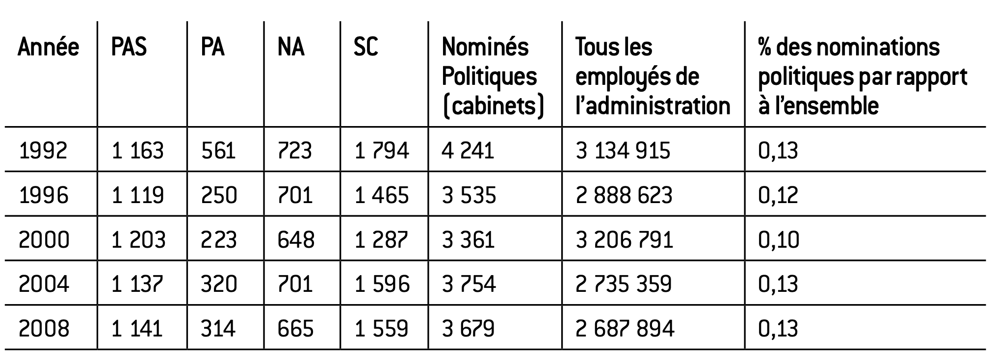 La structure de l’État américain et de sa fonction publique est complexe. Sur les trois niveaux de gouvernement (État fédéral, États, gouvernements locaux), le gouvernement fédéral représente une faible administration en comparaison des deux autres. En 1998, les fonctionnaires travaillant pour le niveau fédéral représentaient seulement 13,9% de l’emploi public total aux États-Unis. Un autre particularisme caractérise l’organisation administrative des États-Unis : il s’agit de la séparation stricte entre les rôles des acteurs politiques et ceux des hauts fonctionnaires, qui empêche à ces derniers d’exercer une trop grande part de pouvoir par rapport aux élus30. Jimmy Carter a introduit une réforme via le Civil Service Reform Act en 1978 qui assouplit considérablement le recrutement et la mobilité des hauts fonctionnaires avec la création d’un corps (les SES, Senior Executive Service) dont le recrutement peut se faire à l’extérieur des agences d’État. C’est ainsi qu’aujourd’hui les plus hauts niveaux de l’administration sont constitués de postes à la discrétion du président américain seul (PA, Presidential Appointment), conjointement avec le Sénat (PAS, Presidential Appointment with Senate Confirmation), des Senior Executive Service (NA, Non Career Appointment) et des SC (Schedule C Appointments) qui assistent les autres. Tous ces échelons, aux niveaux de responsabilités différents constituent des nominations politiques.