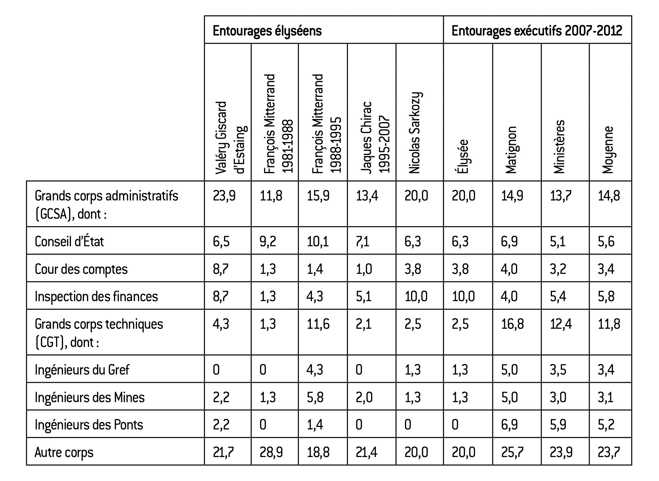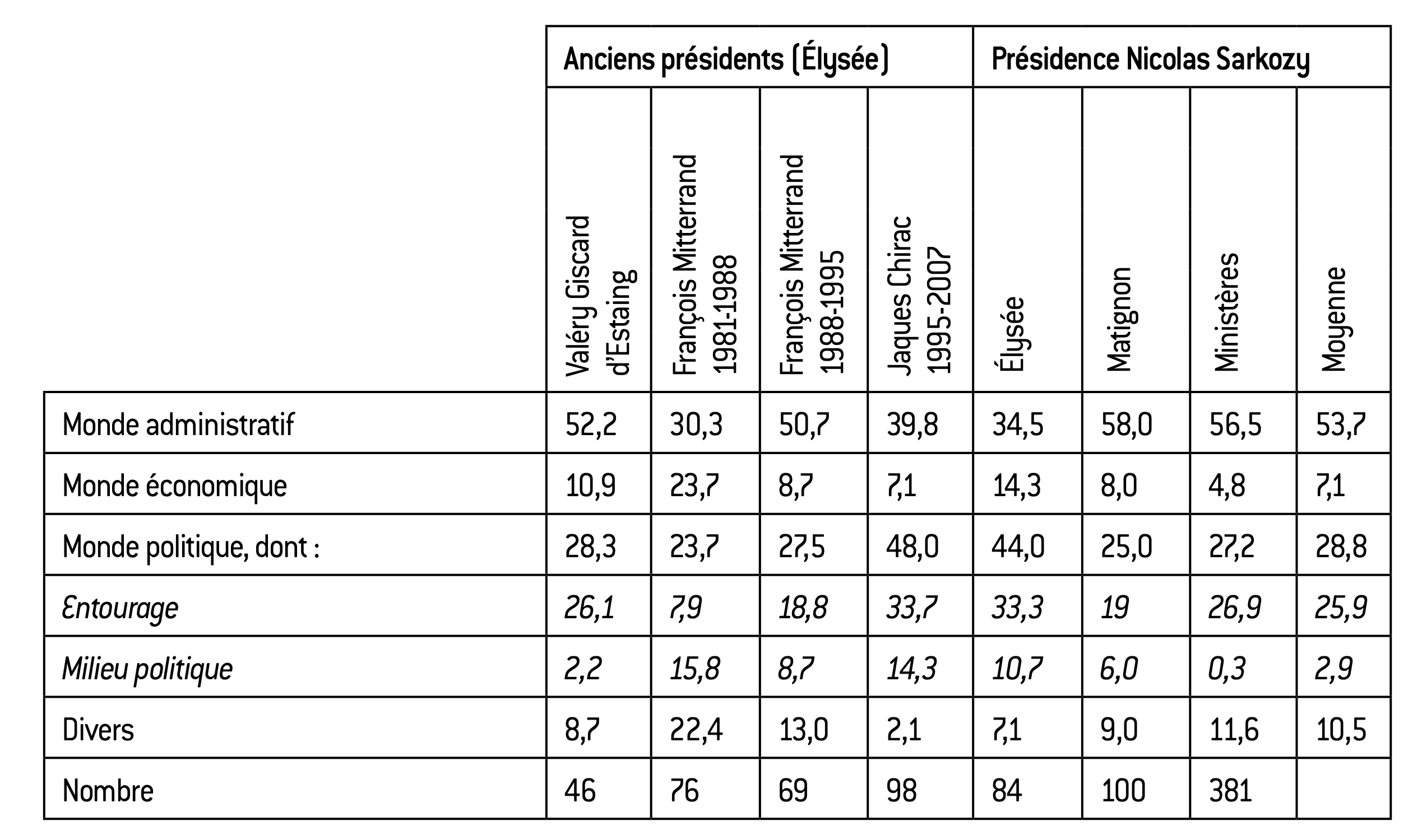 Dans cet écosystème où l’endogamie est la règle et ou la diversité des équipes n’a pas cours, on trouve très peu de profils atypiques. Luc Rouban démontre par ailleurs59 que la capacité d’organisation d’un corps – même de petit effectif – démultiplie considérablement son impact et son pouvoir. Dans une récente recherche60, il recense les sources de recrutement des cabinets présidentiels sous quatre mandatures et analyse la composition de tous les cabinets gouvernementaux sous la présidence Sarkozy. Le résultat est sans appel : seuls 7,1% des membres de cette élite sont issus du monde économique.