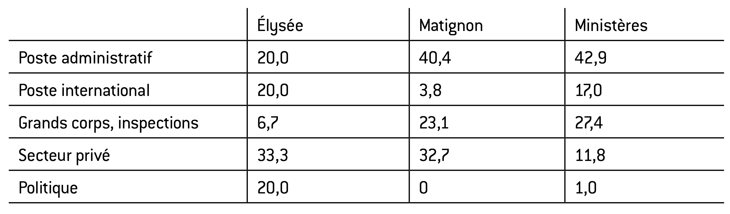 William Genyies et Patrick Hassenteufel ont quant à eux démontré55 que les entourages allemands et anglais des élus politiques sont également bien plus diversifiés qu’en France : « En Allemagne nous avons identifié une coalition programmatique comprenant des acteurs plus diversifiés (parlementaires, ministres, fonctionnaires politiques, experts) que dans le cas français, ce qui explique notamment le caractère plus négocié et plus progressif des changements. En Grande-Bretagne, les entourages du Premier ministre et des ministres de la Santé, composés d’experts universitaires et de managers, forment des équipes programmatiques intervenant dans les processus décisionnels sur des périodes plus courtes qu’en France et élaborant des changements au niveau des instruments essentiellement. » Luc Rouban a, pour sa part, conclu à une très forte proportion de hauts fonctionnaires dans les entourages ministériels : « Existe-t-il des profils types de carrière avant d’entrer dans un cabinet ministériel ? La réponse est positive, car la très grande majorité des impétrants vient directement d’un poste administratif (ne dépassant pas le niveau de sous-directeur) ou bien d’un poste de direction administratif (chef de service ou directeur d’administration centrale). Plus de 84% des directeurs de cabinet et plus de 90% des conseillers techniques étaient soit sur un poste administratif, soit déjà dans un cabinet avant d’occuper le poste qui est le leur au moment de la saisie56. »
