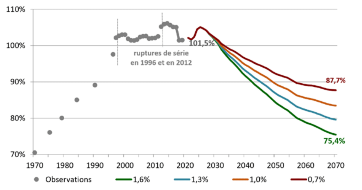 – Sur le taux de croissance de l’économie (productivité, taux d’emploi, espérance de vie, fécondité) et le niveau des pensions en part de PIB, les dernières projections du COR à l’horizon 2070 ont été retenues et maintenues constantes au-delà ;