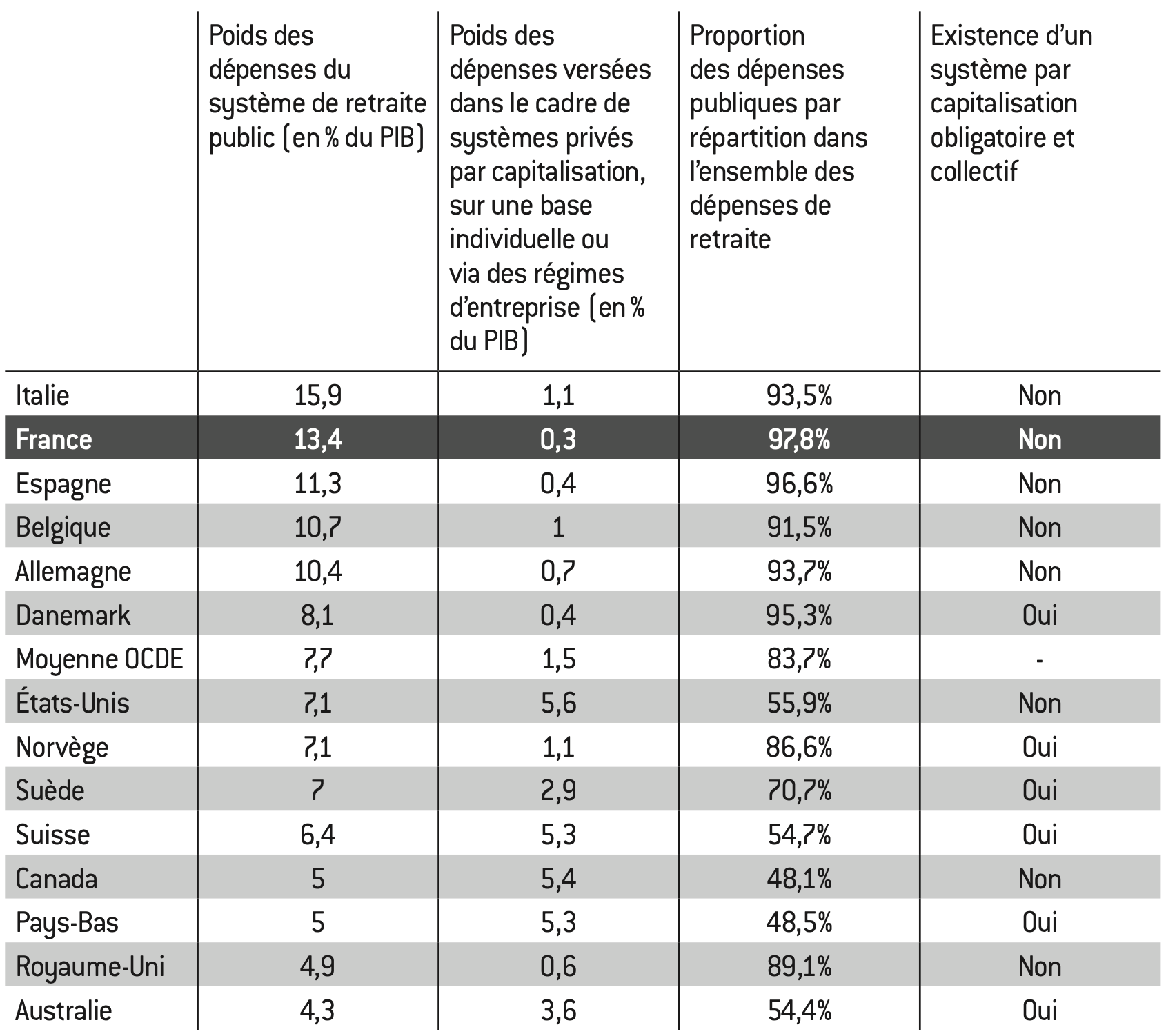La France est le second pays après l’Italie en termes de dépenses dans le système de retraite public (13,4% du PIB) avec une part très élevée de la répartition dans les dépenses totales (97,8%). Si la France n’est pas le seul pays avec un système similaire, elle est le pays qui a le moins ouvert son système de retraite à la capitalisation. Dans certains pays comme au Canada ou aux Pays-Bas, la proportion des dépenses publiques par répartition représente moins de la moitié du total des dépenses.
