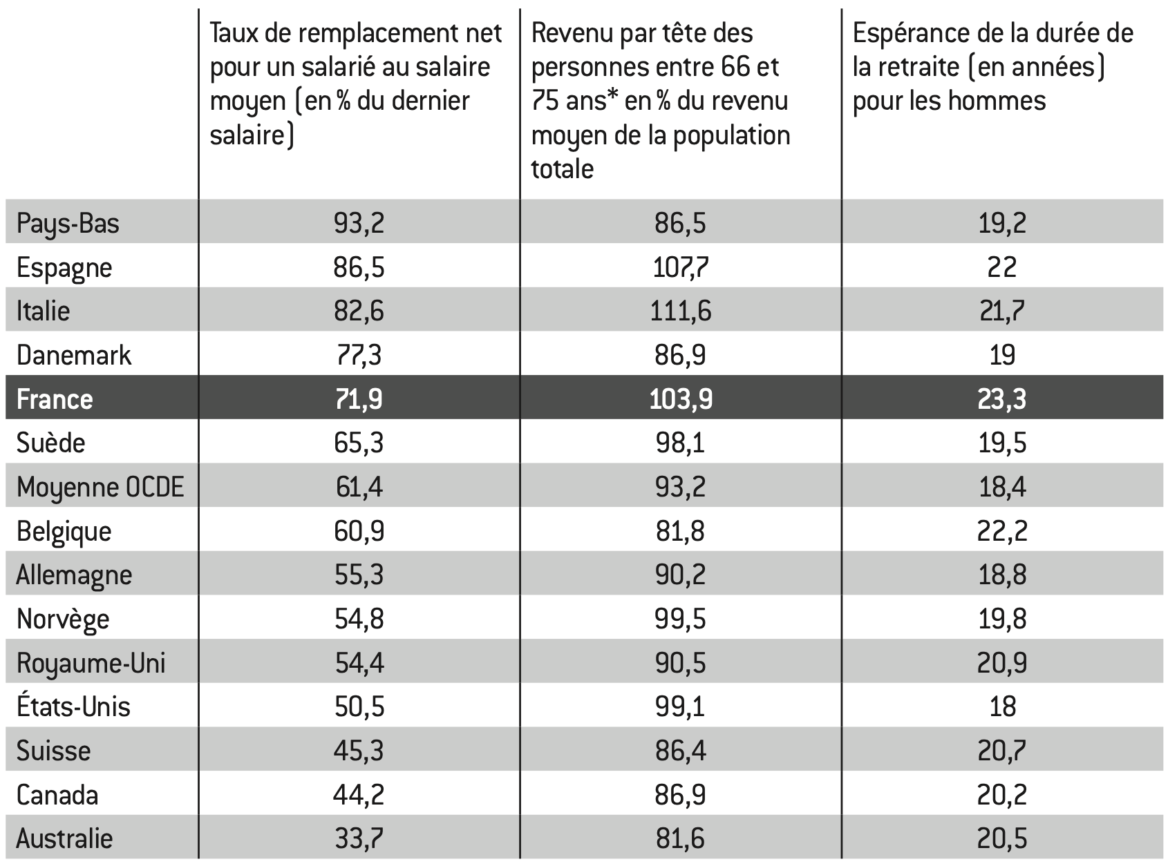 La France figure parmi les pays les plus « généreux » de l’OCDE en termes de taux de remplacement (ratio montant des pensions / rémunération du travail). Cette situation est encore plus singulière si l’on considère le niveau de vie relatif par tête (donc en intégrant les autres transferts sociaux, les impôts et les revenus du patrimoine). Elle l’est également en termes d’espérance de vie passée à la retraite.
