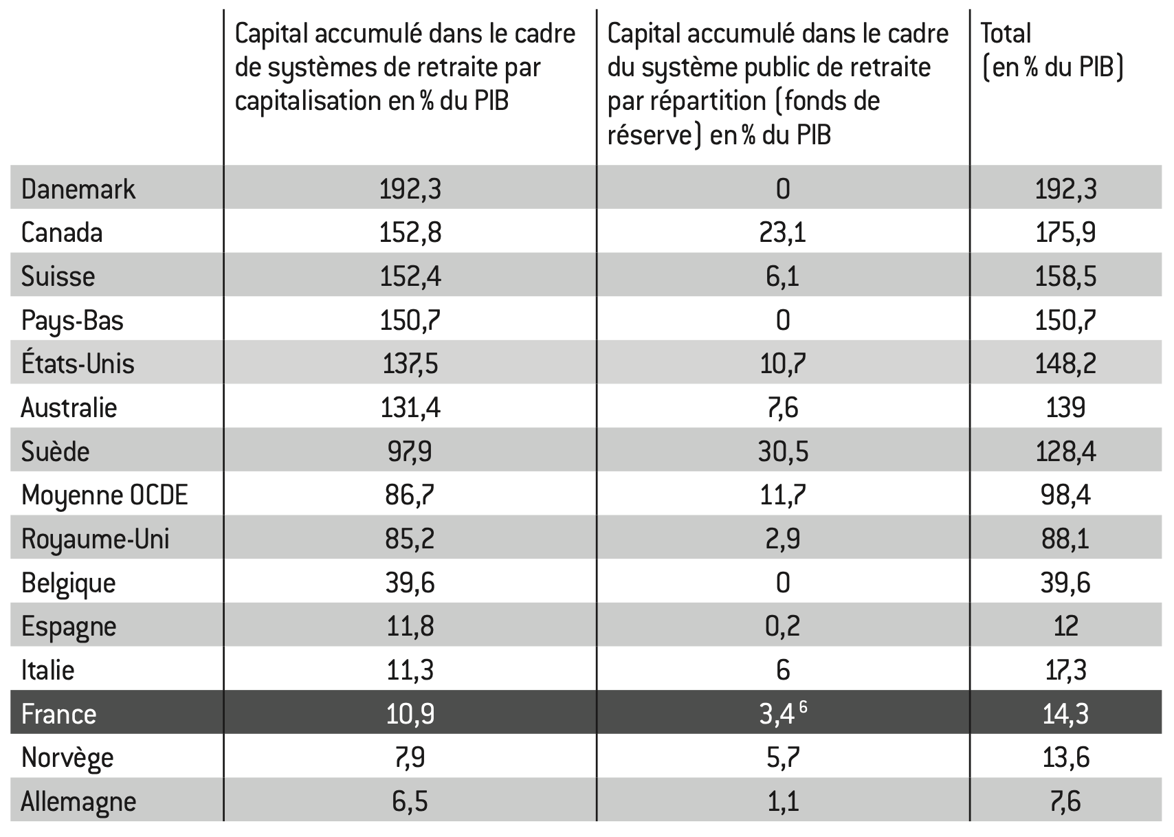 La grande majorité des pays de l’OCDE ont développé des systèmes par capitalisation volontaires ou obligatoires, ce qui explique l’existence d’un stock de capital dédié au financement des retraites. En outre, certains ont également accumulé des fonds de réserve dans le cadre de leurs systèmes publics par répartition. Dans ce cas, l’objectif est de lisser dans le temps les conséquences des évolutions démographiques et de disposer d’un amortisseur en cas d’aléas sur la croissance économique. La France n’ayant fait aucun de ces deux choix, elle se distingue par une extrême faiblesse du stock de capital dédié aux retraites.