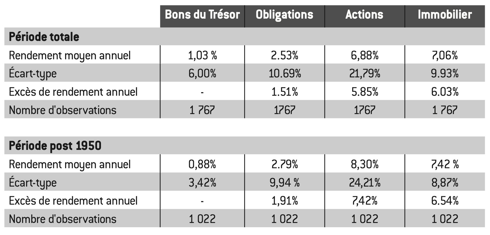 Ainsi, selon une étude récente qui a pu reconstituer des séries de rendement du capital extrêmement longues, les taux de rendement réels (i.e. corrigés de l’inflation) des différentes classes d’actifs au niveau mondial seraient les suivants sur très longue période :