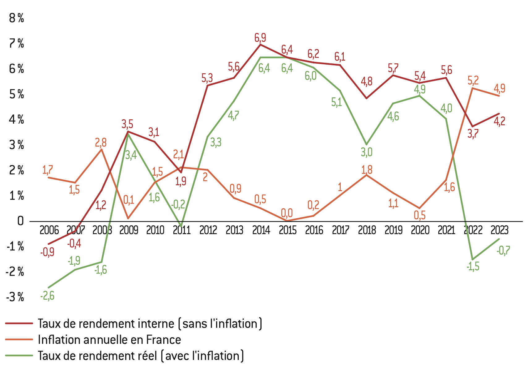 Évolution du taux de rendement interne annualisé depuis 2006 (inflation prise en compte)