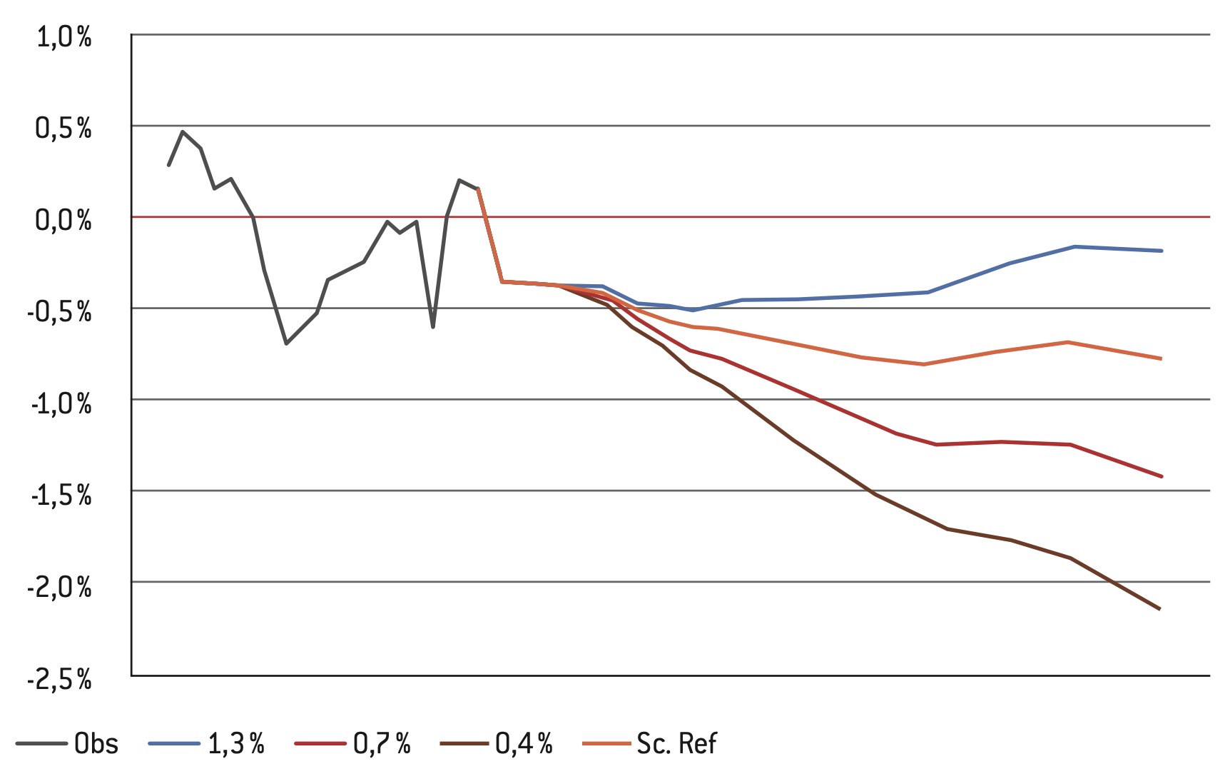 Solde des régimes de retraites (en % du PIB) pour différents scénarios de gains de productivité :