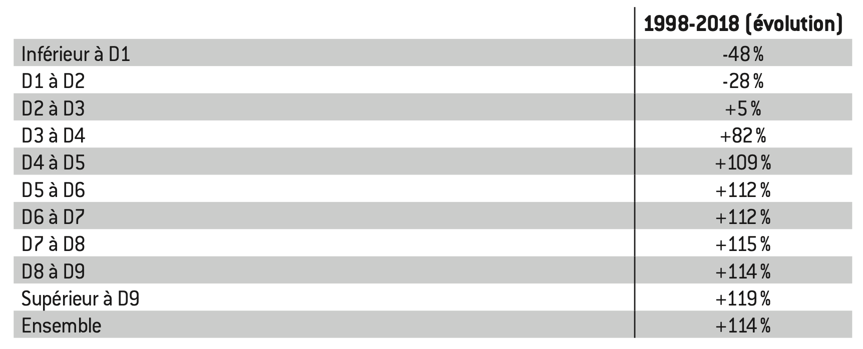 Combinés à une évolution particulièrement favorable de l’immobilier, placement surpondéré chez les ménages les plus riches et les plus âgés, cette situation se manifeste par des évolutions du patrimoine très défavorables aux premiers déciles et aux plus jeunes sur les 20 dernières années :
