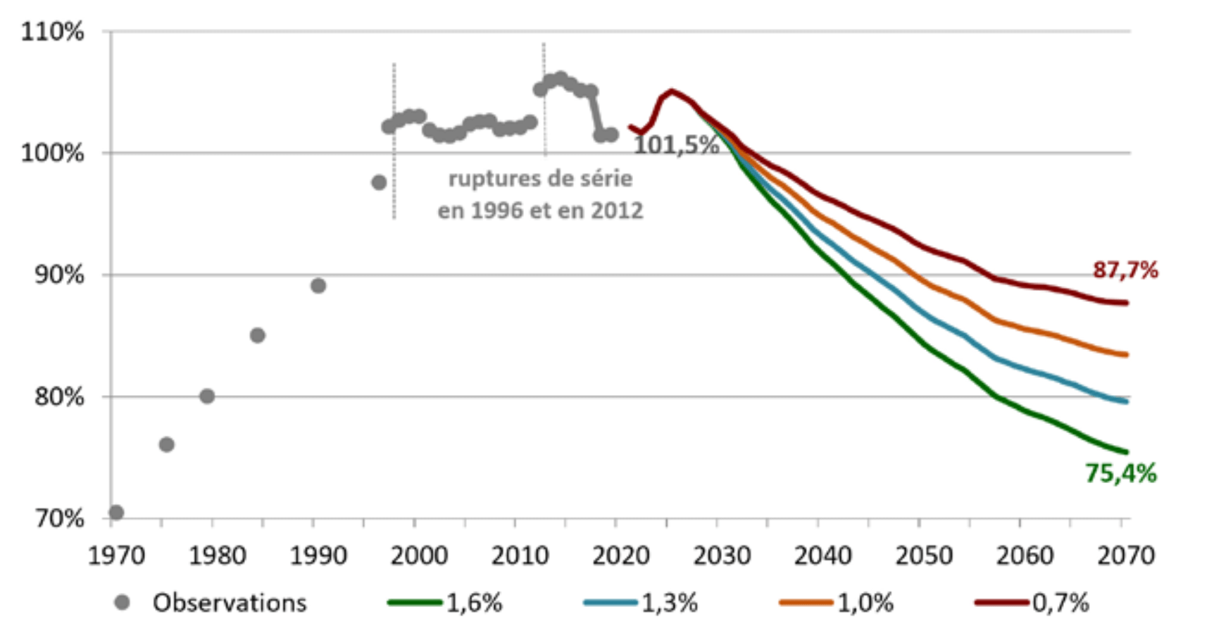– Sur le taux de croissance de l’économie (productivité, taux d’emploi, espérance de vie, fécondité) et le niveau des pensions en part de PIB, les dernières projections du COR à l’horizon 2070 ont été retenues et maintenues constantes au-delà ;