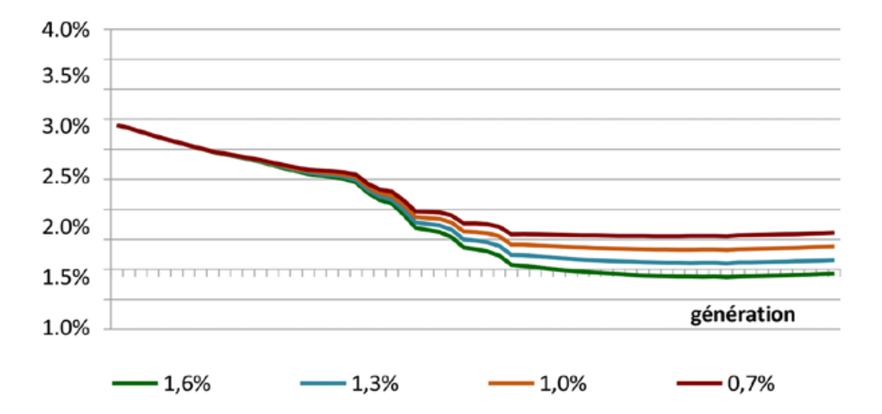Évolution du TRI réel (i.e. après inflation) par génération pour un salarié non-cadre selon différentes hypothèses de croissance de la productivité :