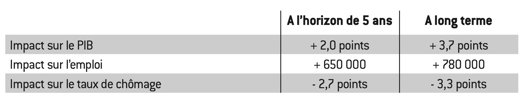 En outre, cette solution apporterait une réponse à l’immense besoin de notre pays d’investir et de se projeter dans l’avenir tout en redonnant des marges de manœuvre à nos entreprises pour innover et éviter un décrochage de notre appareil productif. C’est pourquoi elle devrait figurer en bonne place dans un programme plus vaste de redressement économique et social du pays.