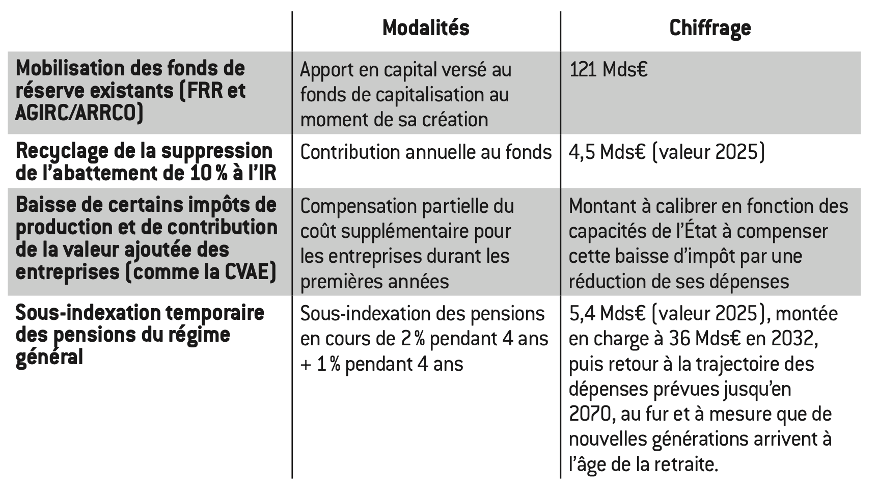 – Une contribution de l’État, financée par une suppression de l’abattement de 10% pour frais professionnels des pensions de l’impôt sur le revenu ;
