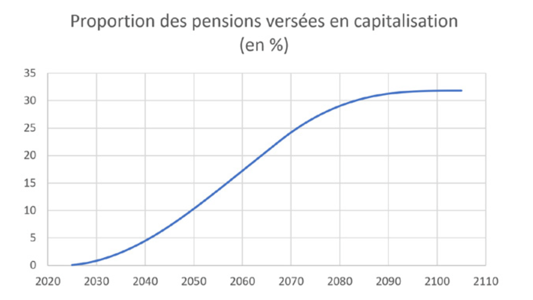 La montée en charge du pilier capitalisation est calibrée de manière à atteindre 33% des pensions en régime de croisière. Compte tenu de la montée en charge progressive du régime (gestion du stock de retraités en cours en répartition pure et entrée à la retraite de nouveaux retraités n’ayant cotisé en capitalisation que pendant une fraction de leur vie active), cette cible ne sera pas atteinte avant 2105. La montée en charge n’est pas linéaire et la proportion de capitalisation dans l’ensemble des pensions devrait évoluer tel que représenté dans le graphique ci-dessous. À l’horizon 2070, qui est celui de nos simulations, la proportion de pensions versées en capitalisation serait de 24% (contre une cible de 33% au-delà de 2100).