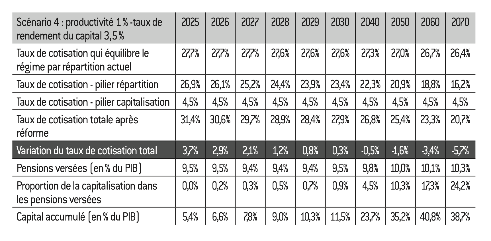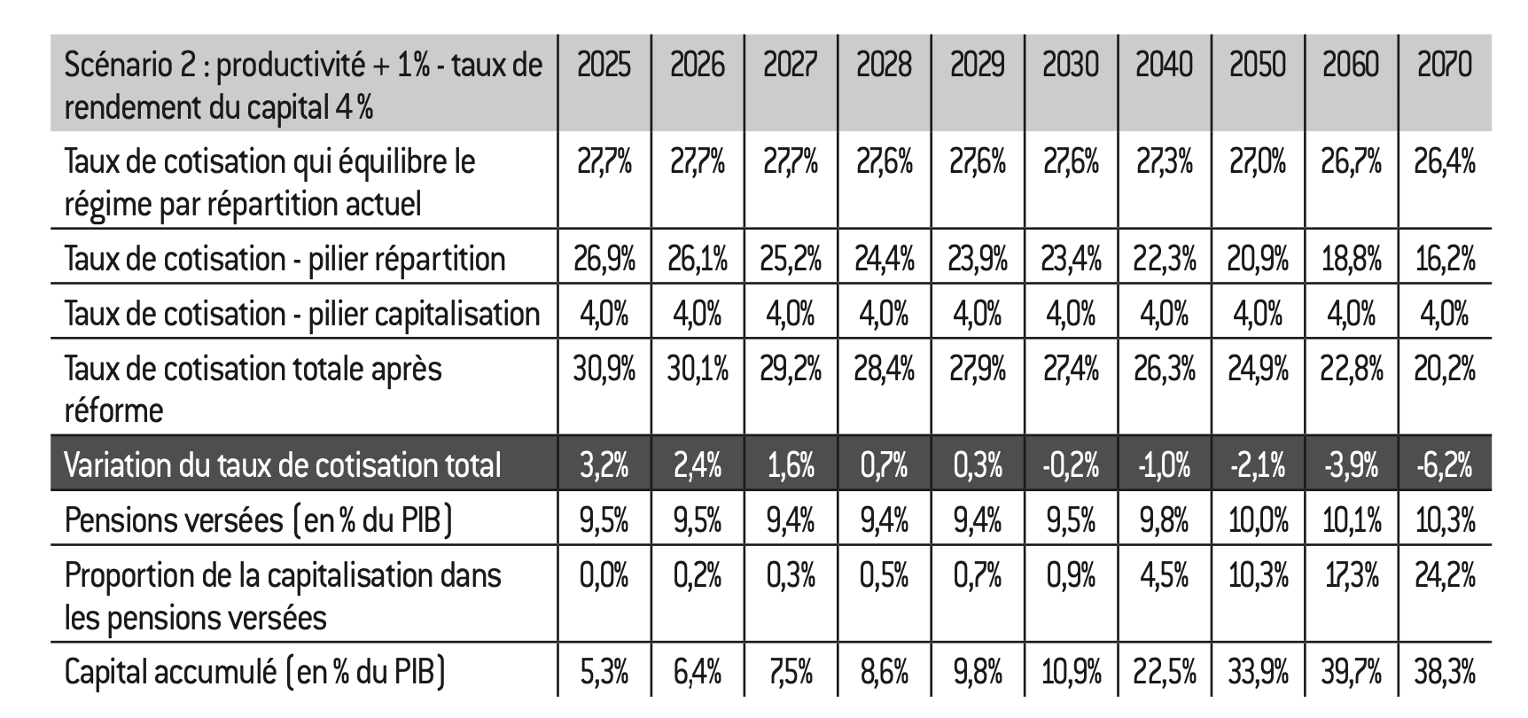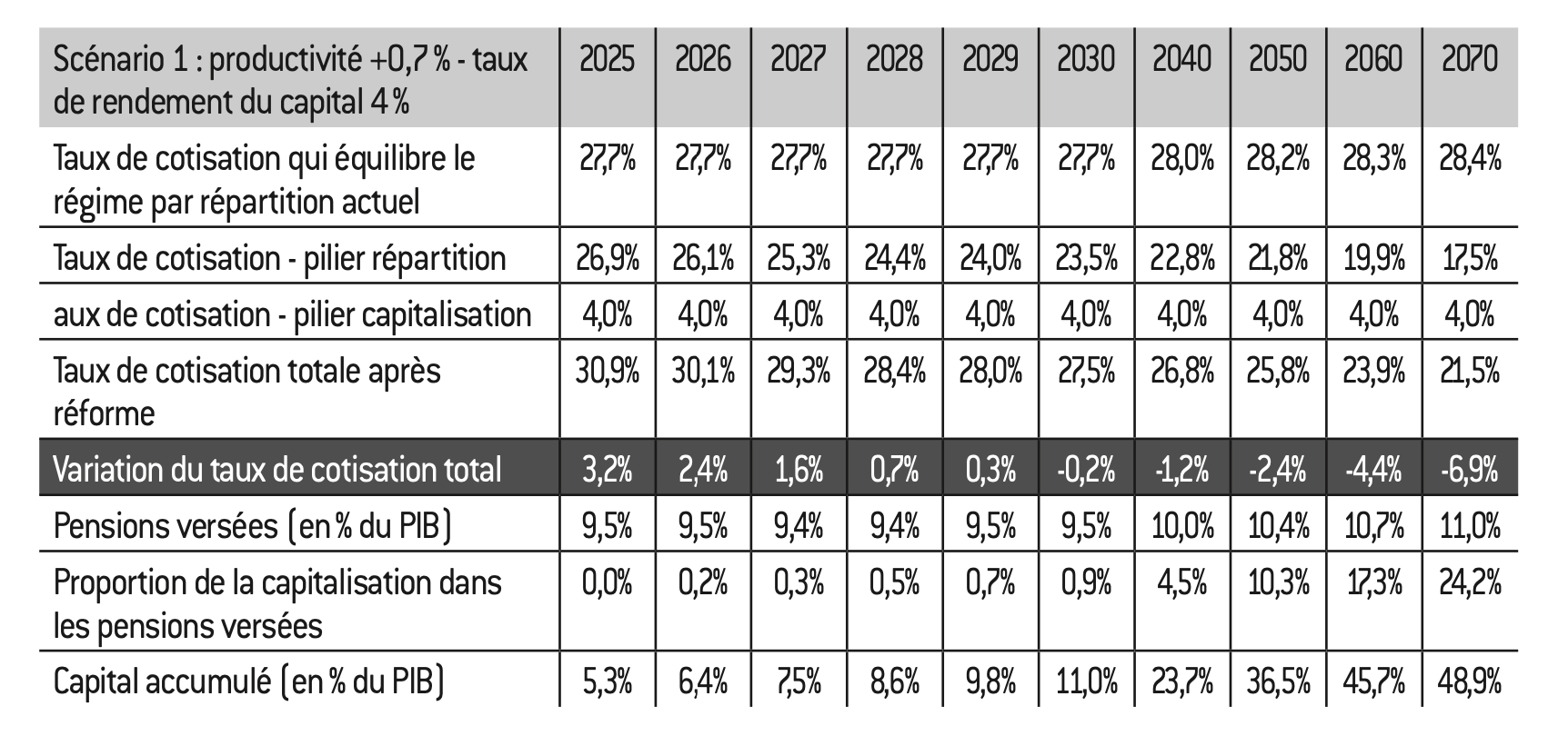 – Les paramètres actuels du système par répartition autres que les taux de cotisation (durées de cotisations, âges effectifs de départ…) ont été conservés. En revanche, les taux de cotisations au régime par répartition ont été relevés dans tous les scénarios de manière à équilibrer chaque année le pilier par répartition, l’introduction d’un pilier par capitalisation n’ayant pas vocation à « éponger » les déficits du système actuel28 ;