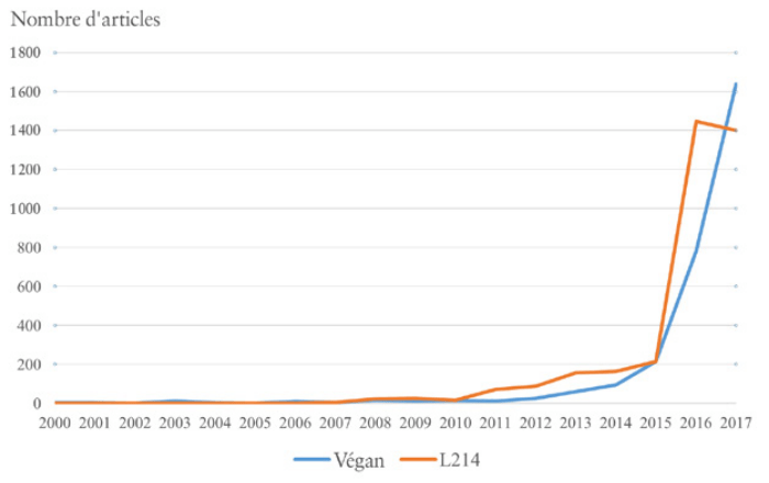 Graphique 1 : Nombre d’articles dans la presse écrite française mentionnant au moins une fois « L214 » (association) ou le mot « végan », 2000-2017